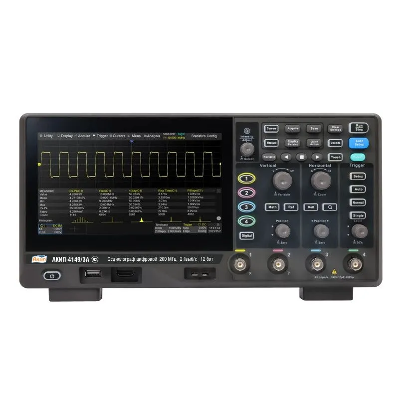 АКИП-4149/1 — современный цифровой осциллограф, спроектированный для точного анализа электрических сигналов в частотном диапазоне от нескольких Гц до сотен МГц. Модель отличается высоким вертикальным разрешением, быстрым временем отклика и расширенными возможностями съёмки сигналов, что делает её идеальным инструментом для исследования, разработки и диагностики электронных устройств как в лаборатории, так и на производстве. Совместимость с актуальными методиками поверки и интеграция в метрологическую цепочку обеспечивают надежность измерений и соответствие требованиям к качеству.